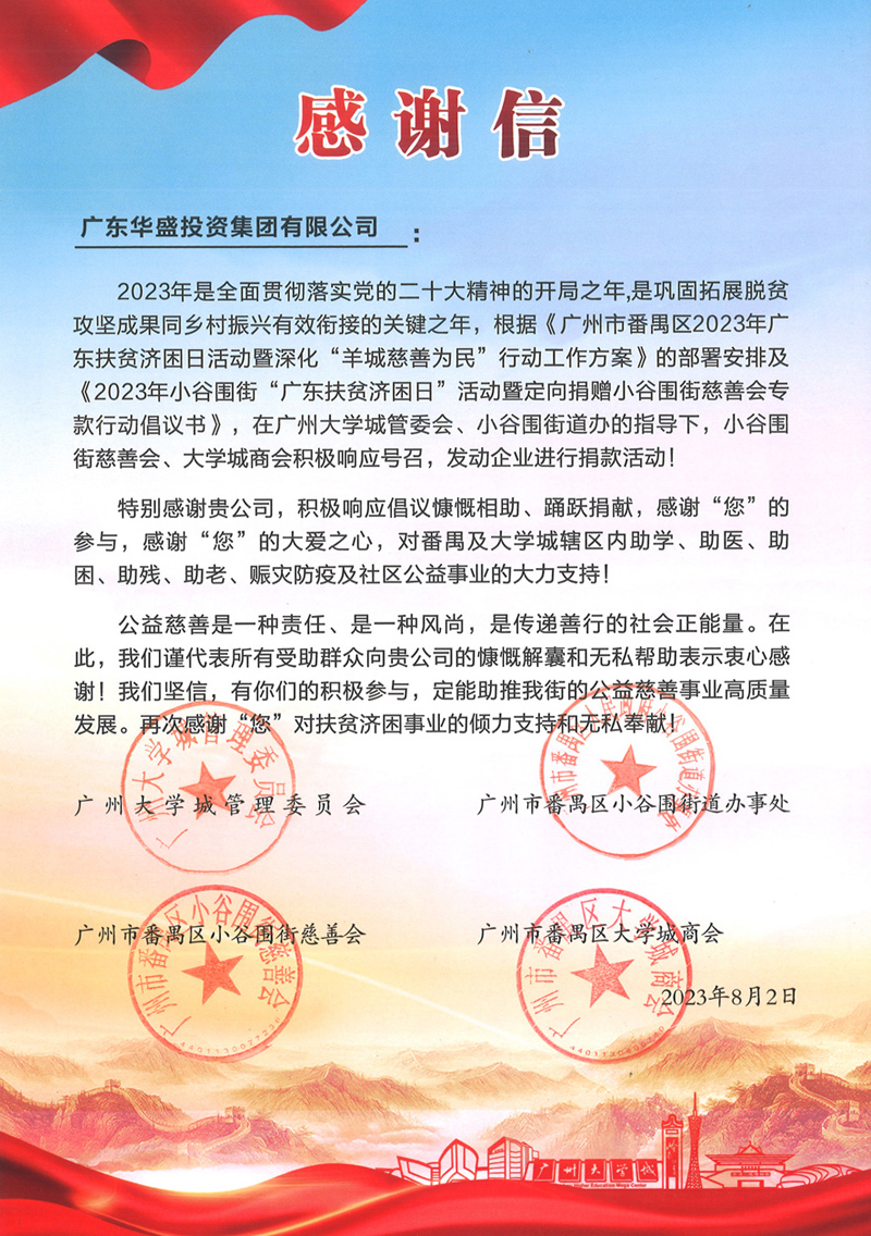 为积极响应广州市番禺区小谷围街“广东扶贫济困日”活动暨定向捐赠小谷围街慈善会专款行动的倡议,开云kaiyun官方版在线入口集团一如既往支持公益,特向小谷围街慈善会捐款善款数万元,持续向社会传递关爱,诠释责任与担当。